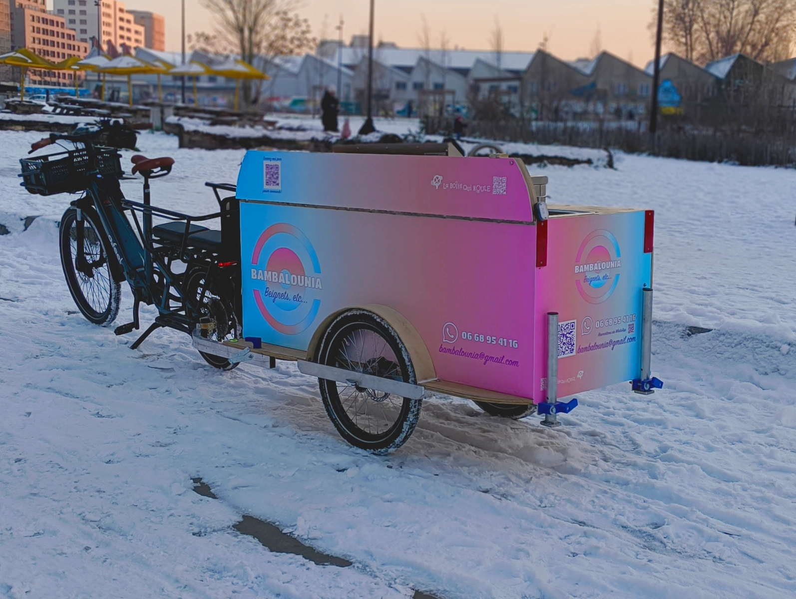 Cette remorque food truck pour vélo est équipée d'une friteuse, d'une plaque à induction et d'un évier. Elle est destinée à la vente de beignets sur le marché ou lors d'évènements à l'extérieur.