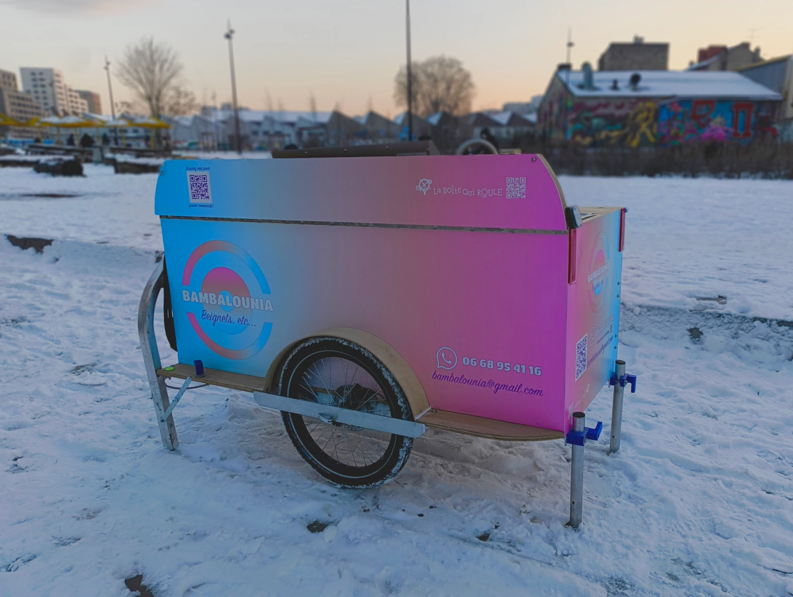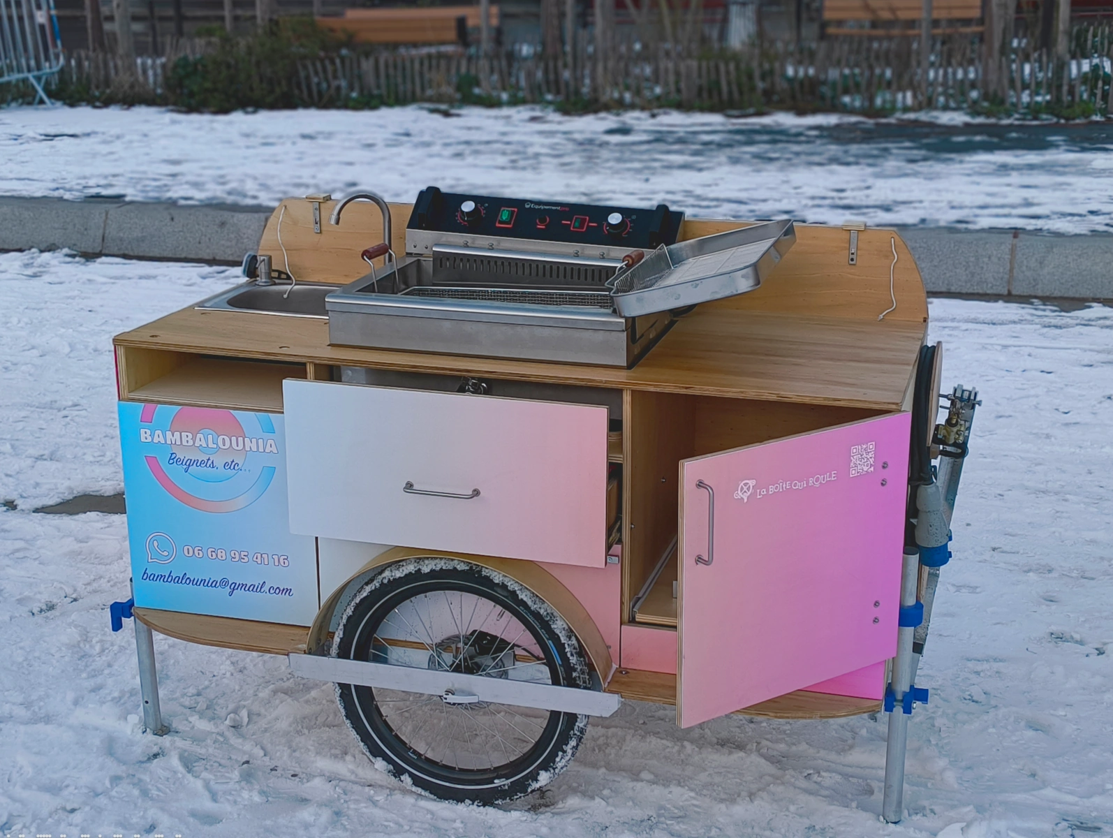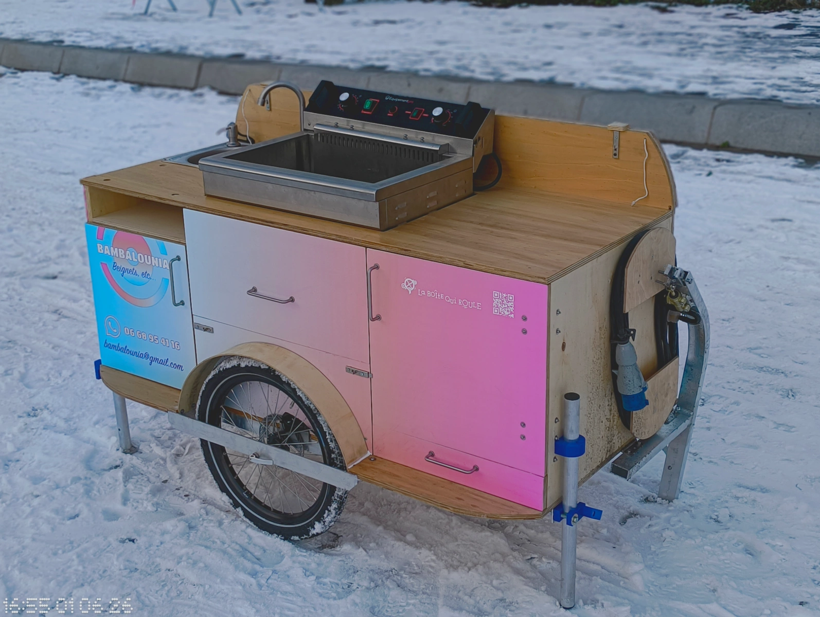 Cette remorque food truck pour vélo est équipée d'une friteuse, d'une plaque à induction et d'un évier. Elle est destinée à la vente de beignets sur le marché ou lors d'évènements à l'extérieur.